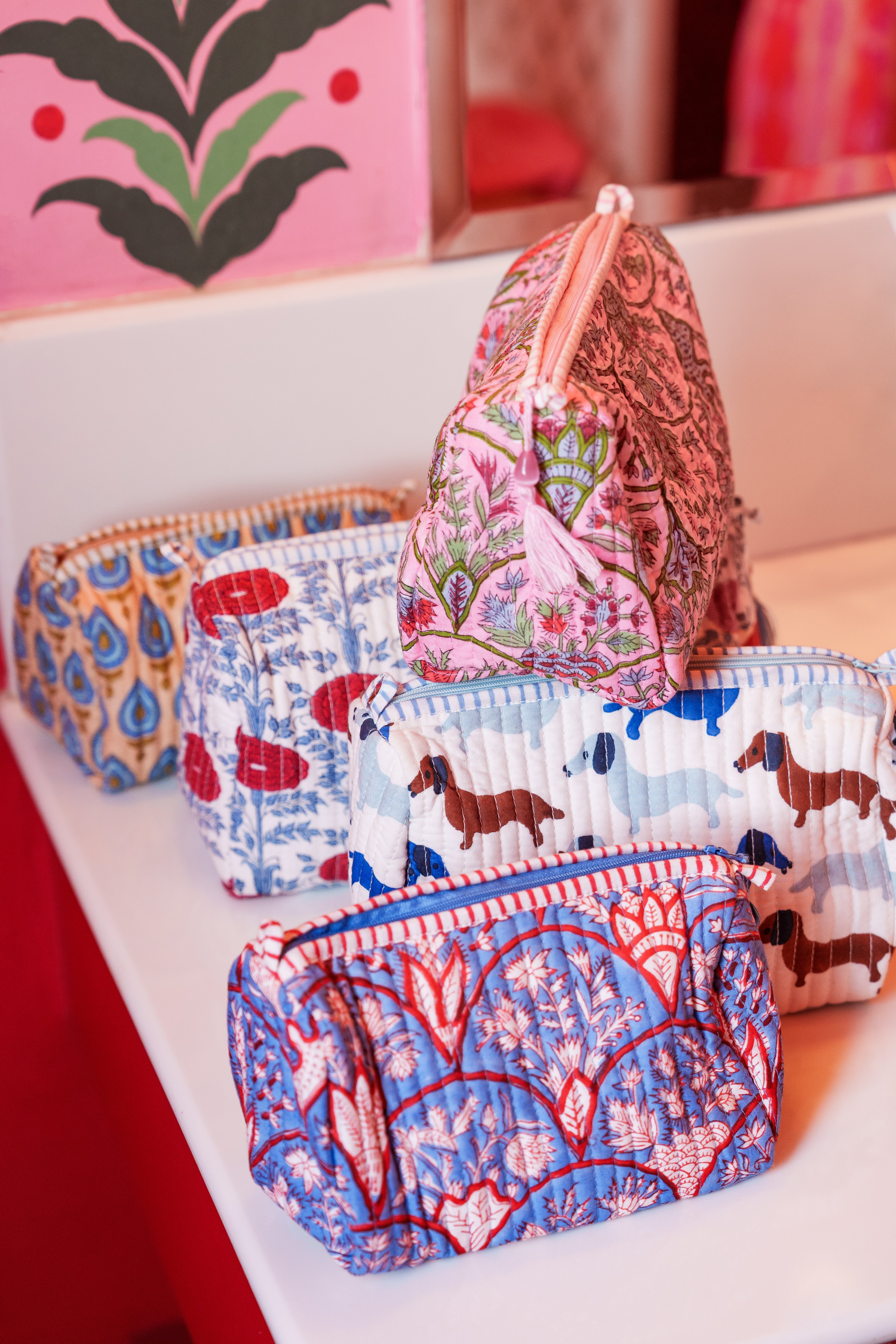 Our best-selling block print toiletry bags come in whimsical patterns with four inner pockets and a wipeable plastic liner for low maintenance care. Perfect to keep your tote bag or backpack organized or for full-sized travel products in your luggage this summer!