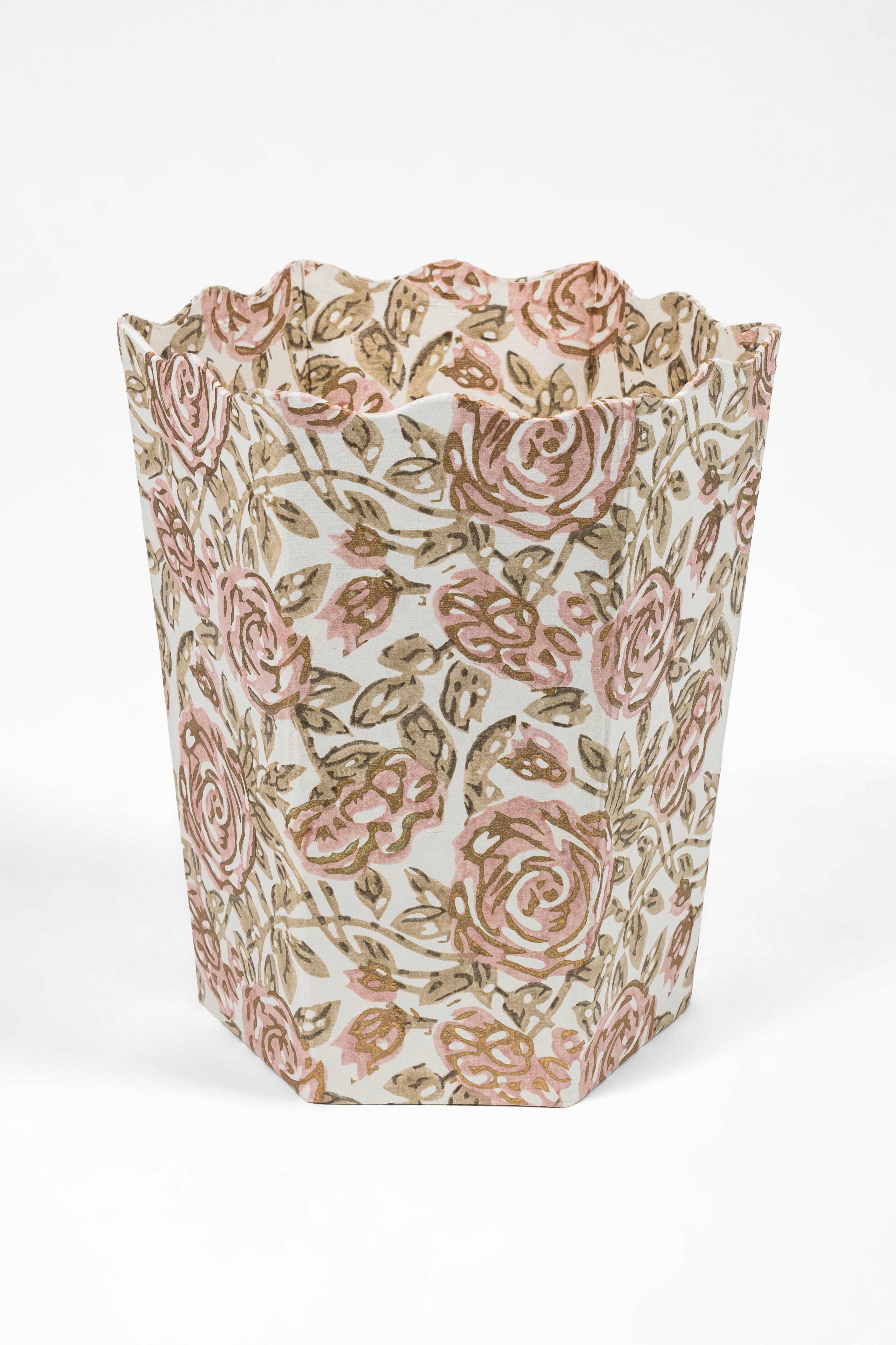 Blockprint Scallop Waste Bin / Storage Bin in Rose Garden