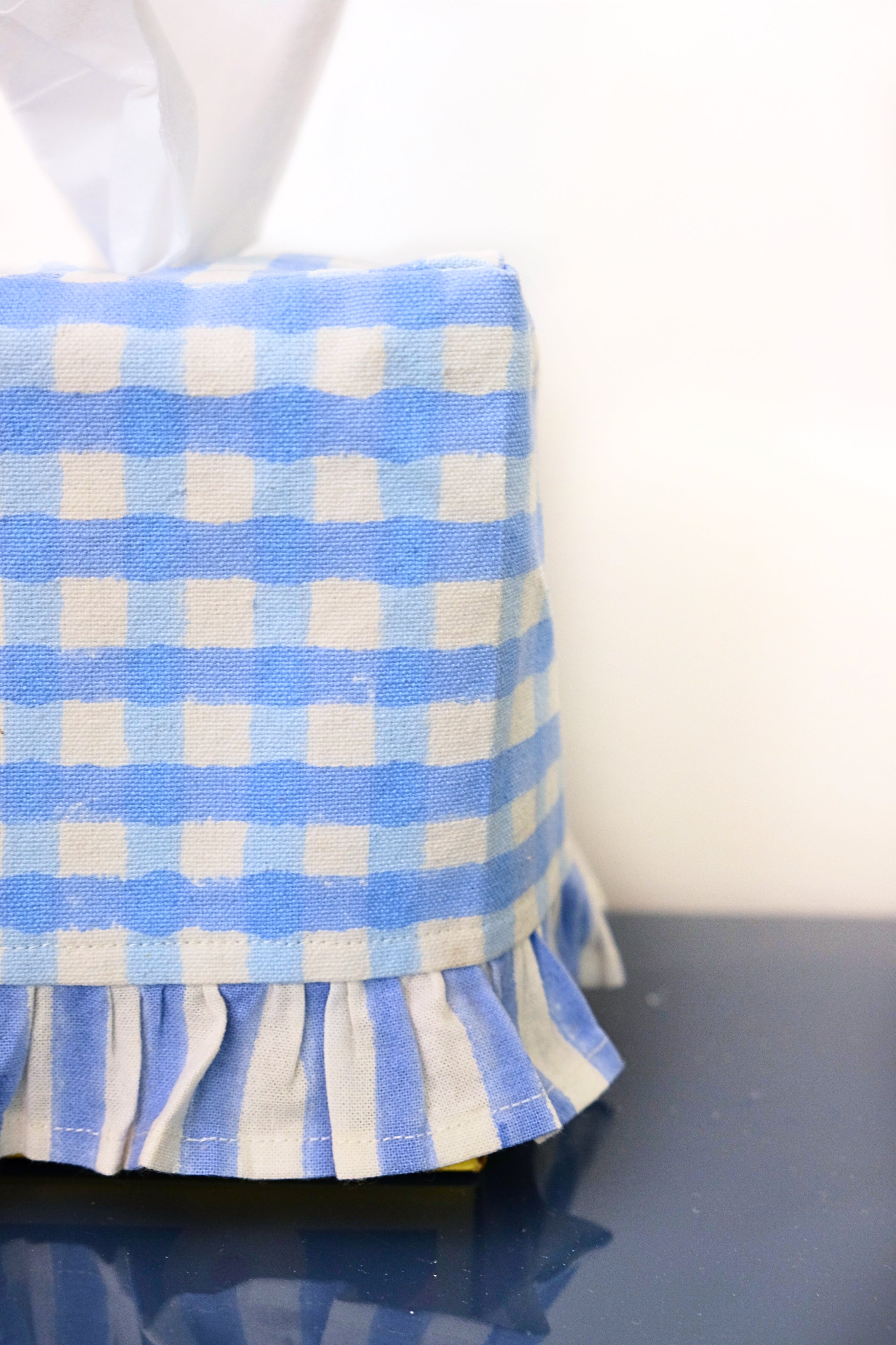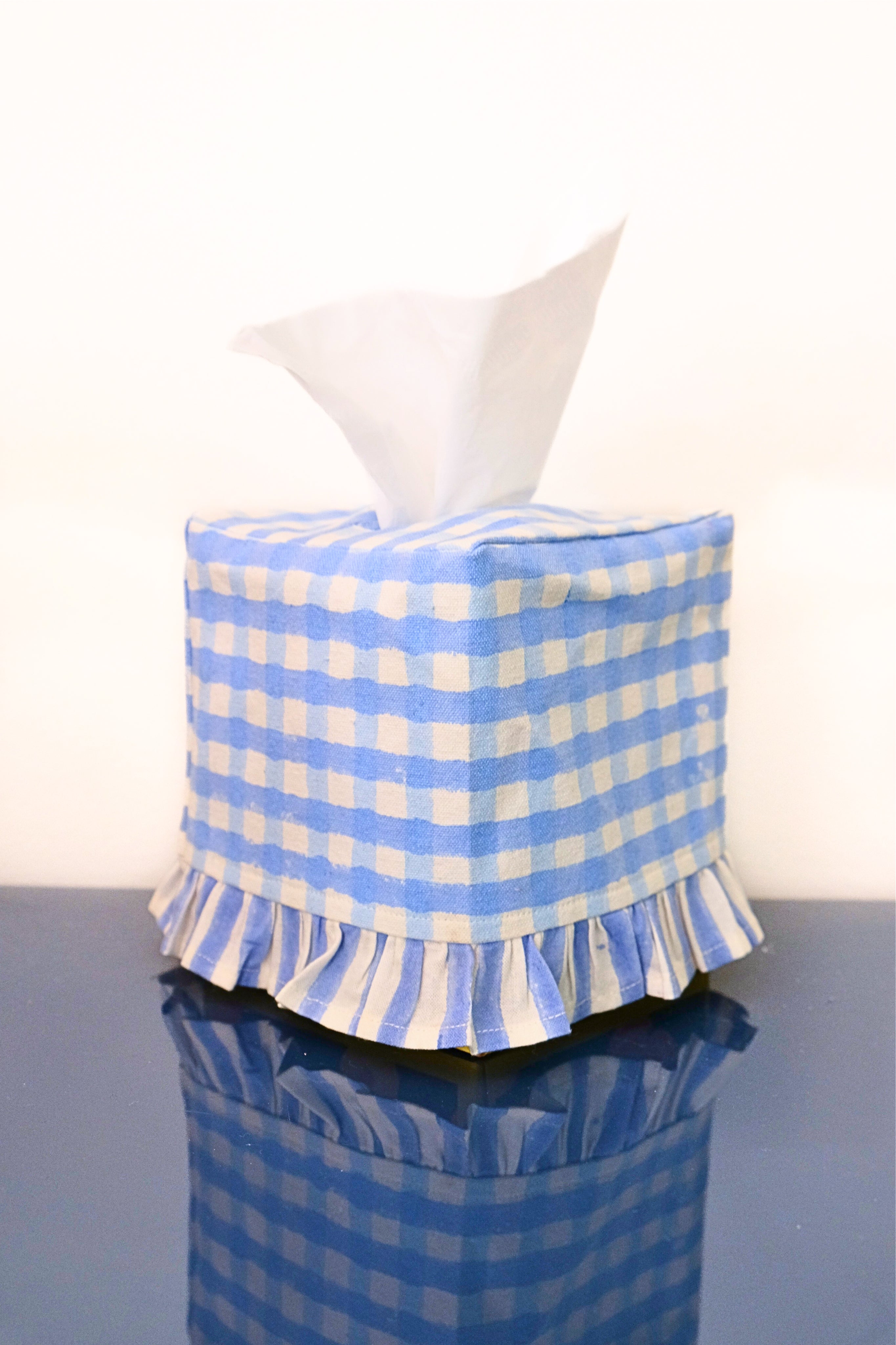 Ruffled Tissue Box Cover in Blue Gingham Blockprint