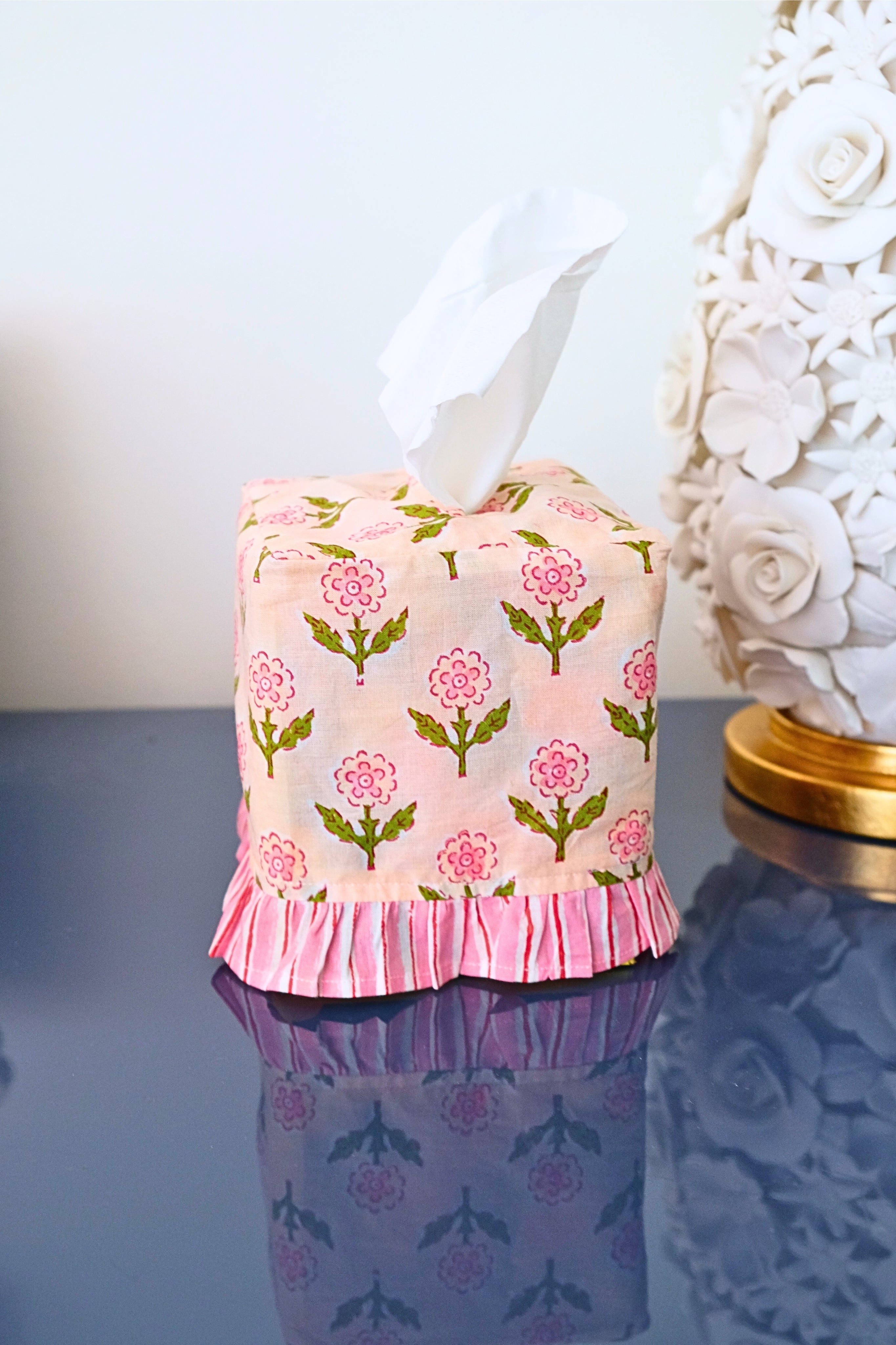 Ruffled Tissue Box Cover in Mona Pink Blockprint