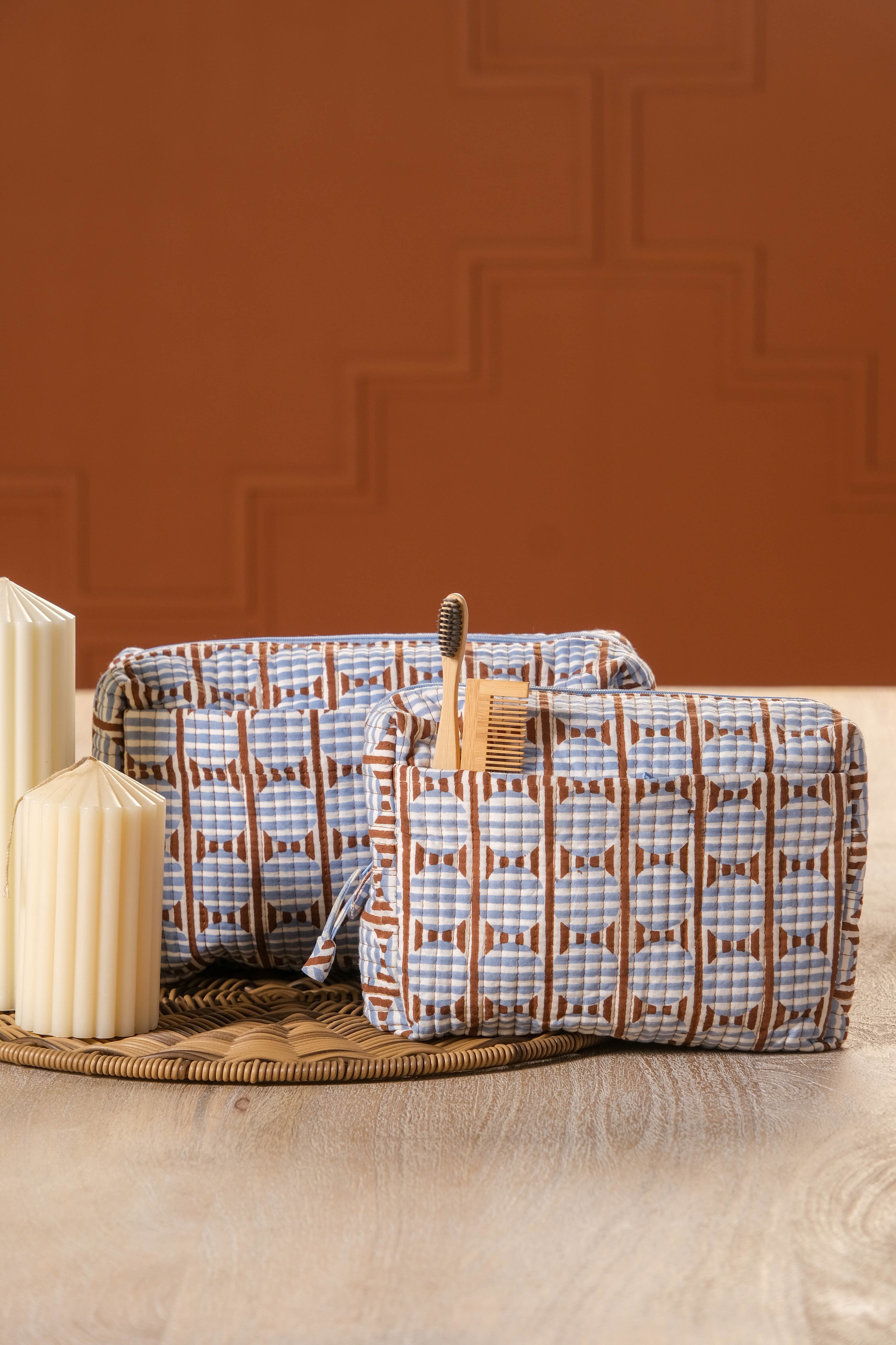 Striped Circles Blockprint Travel Pouch in Brown and Blue