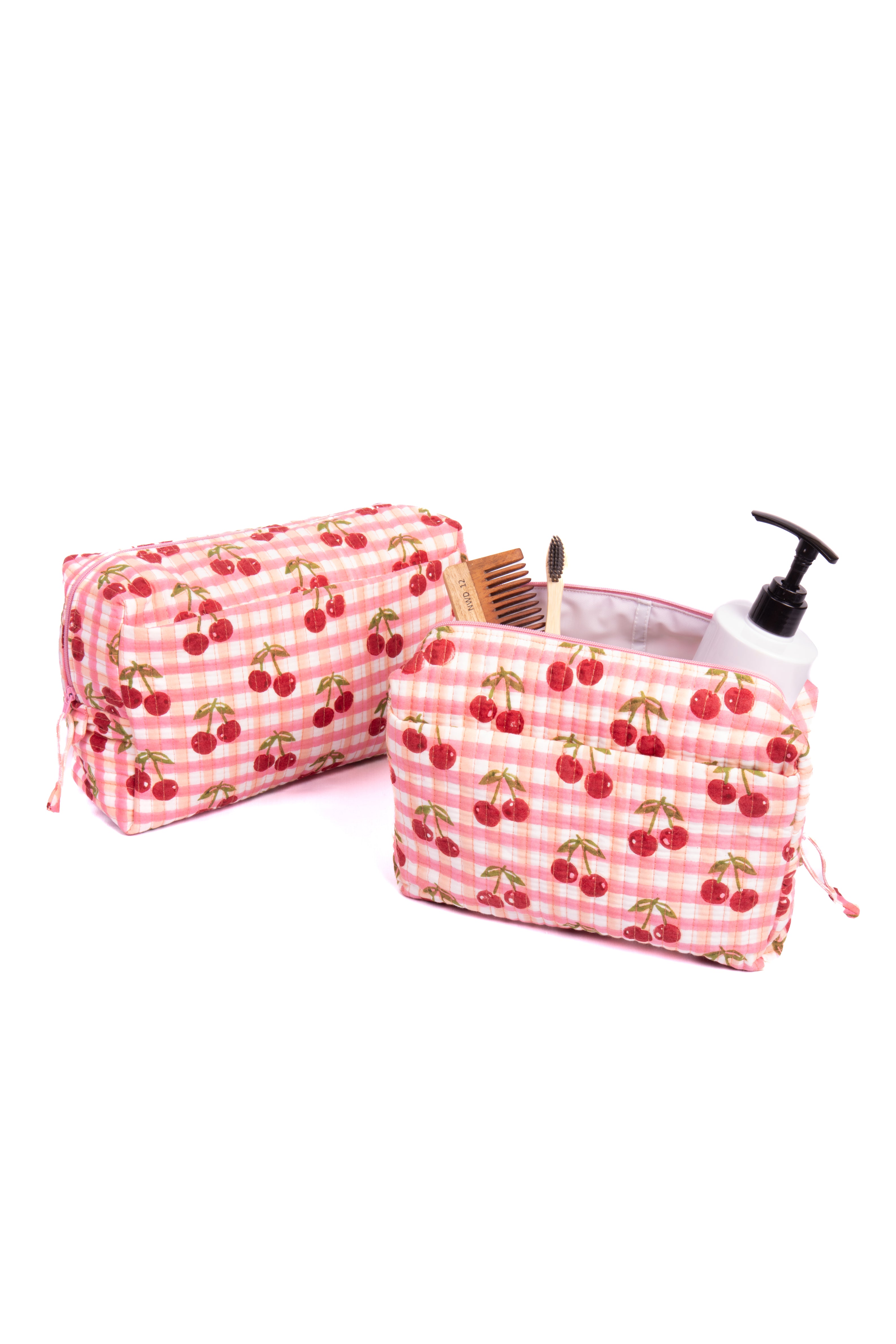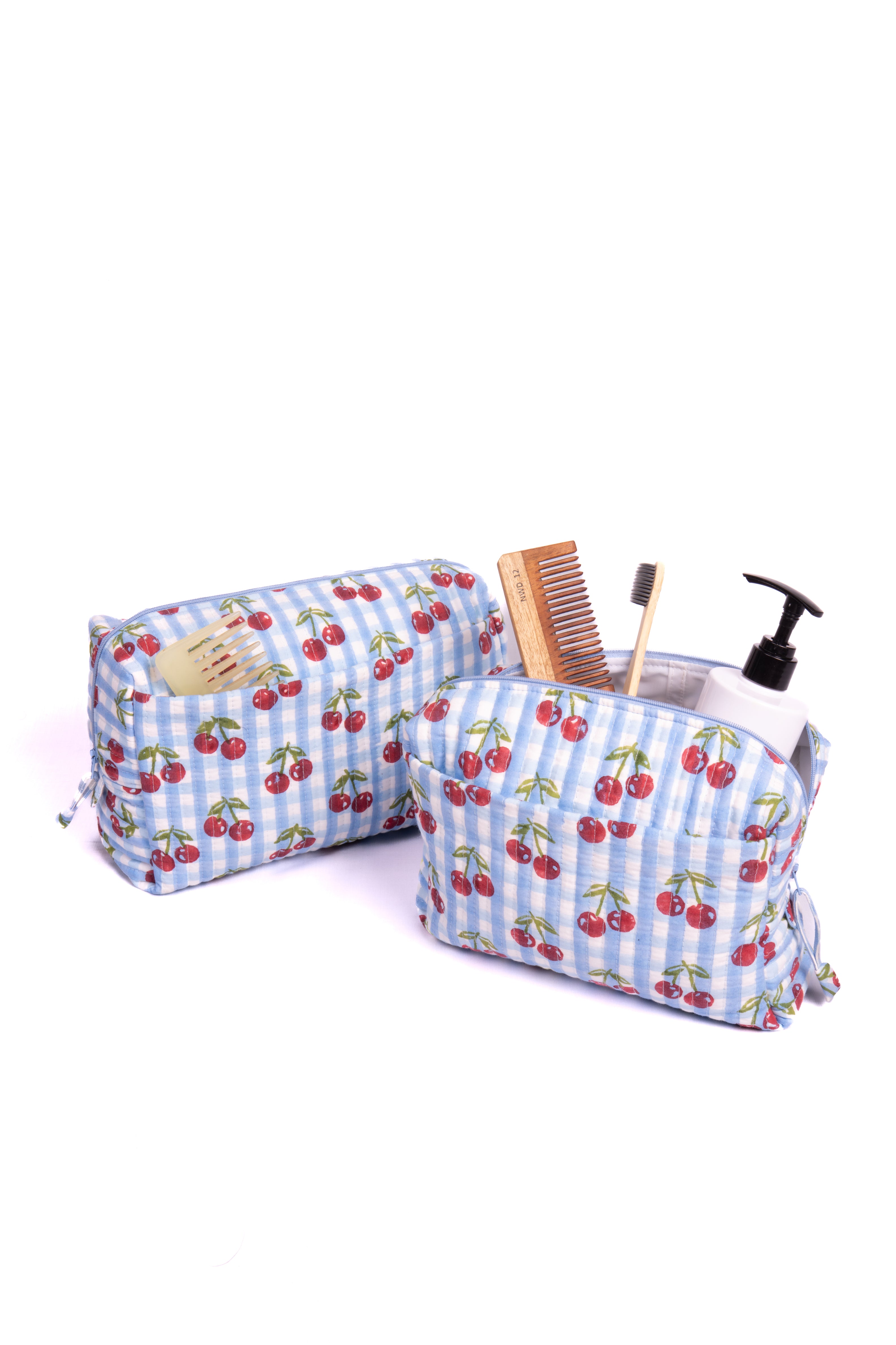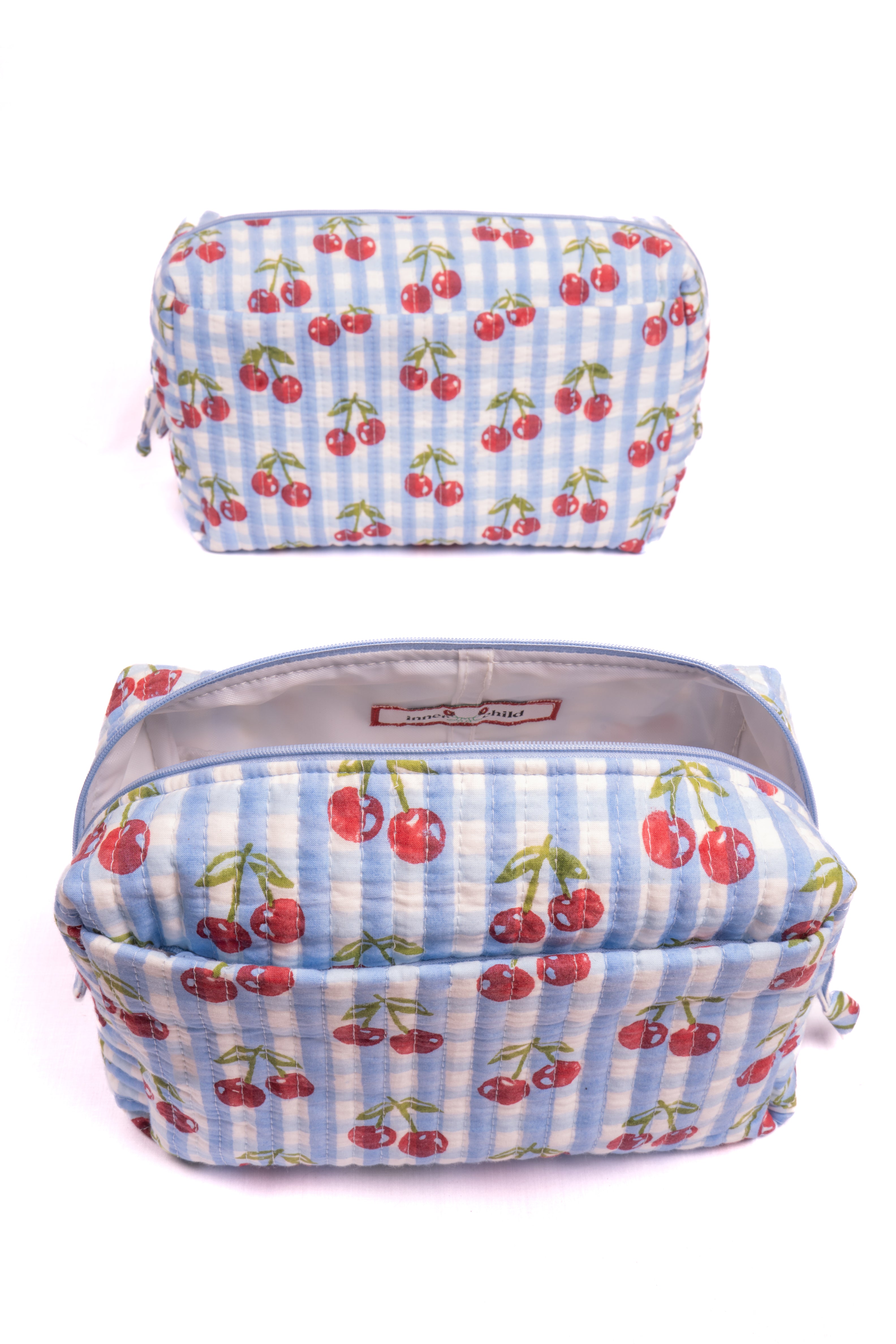 Cherry Makeup Bag in Blue Gingham Blockprint