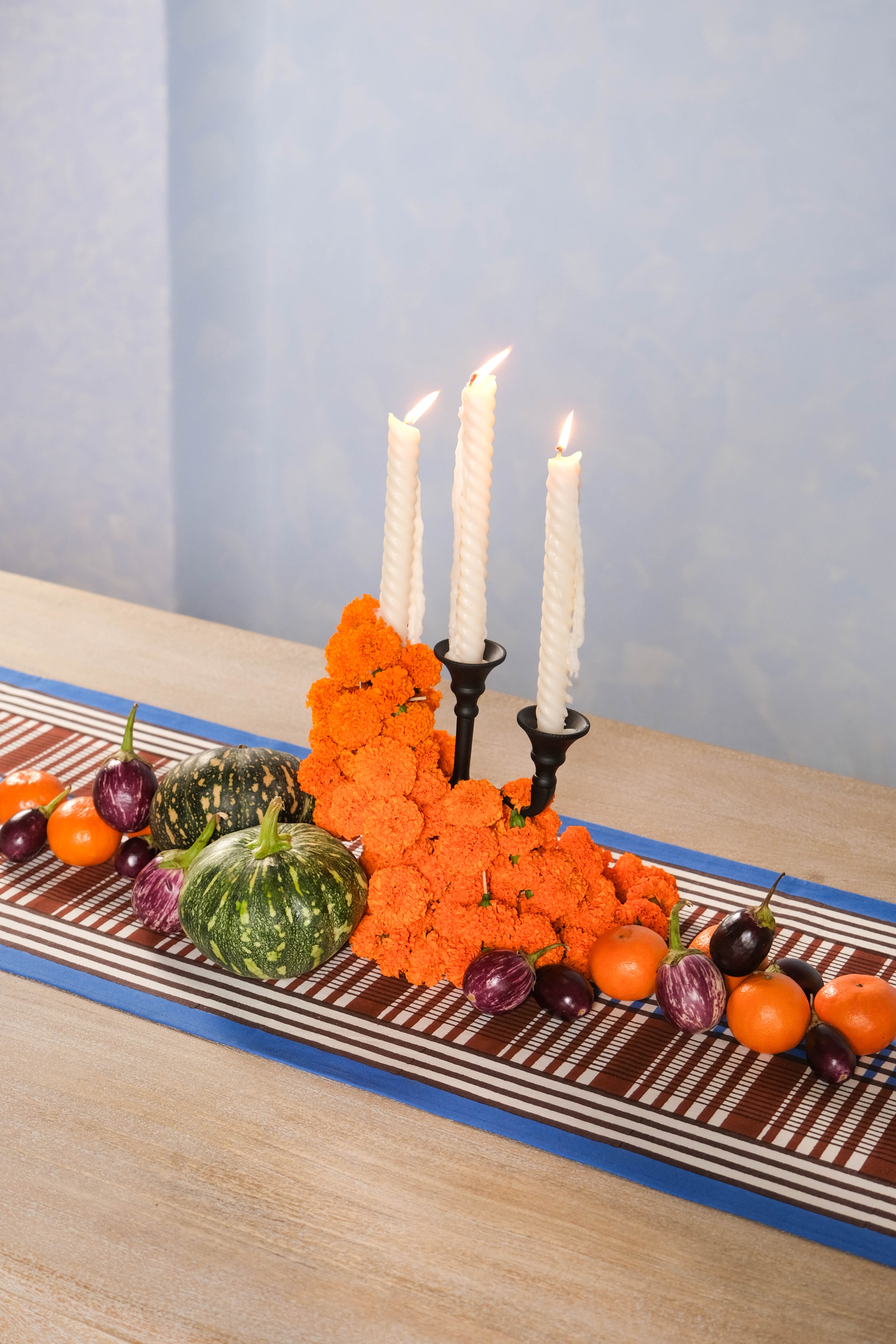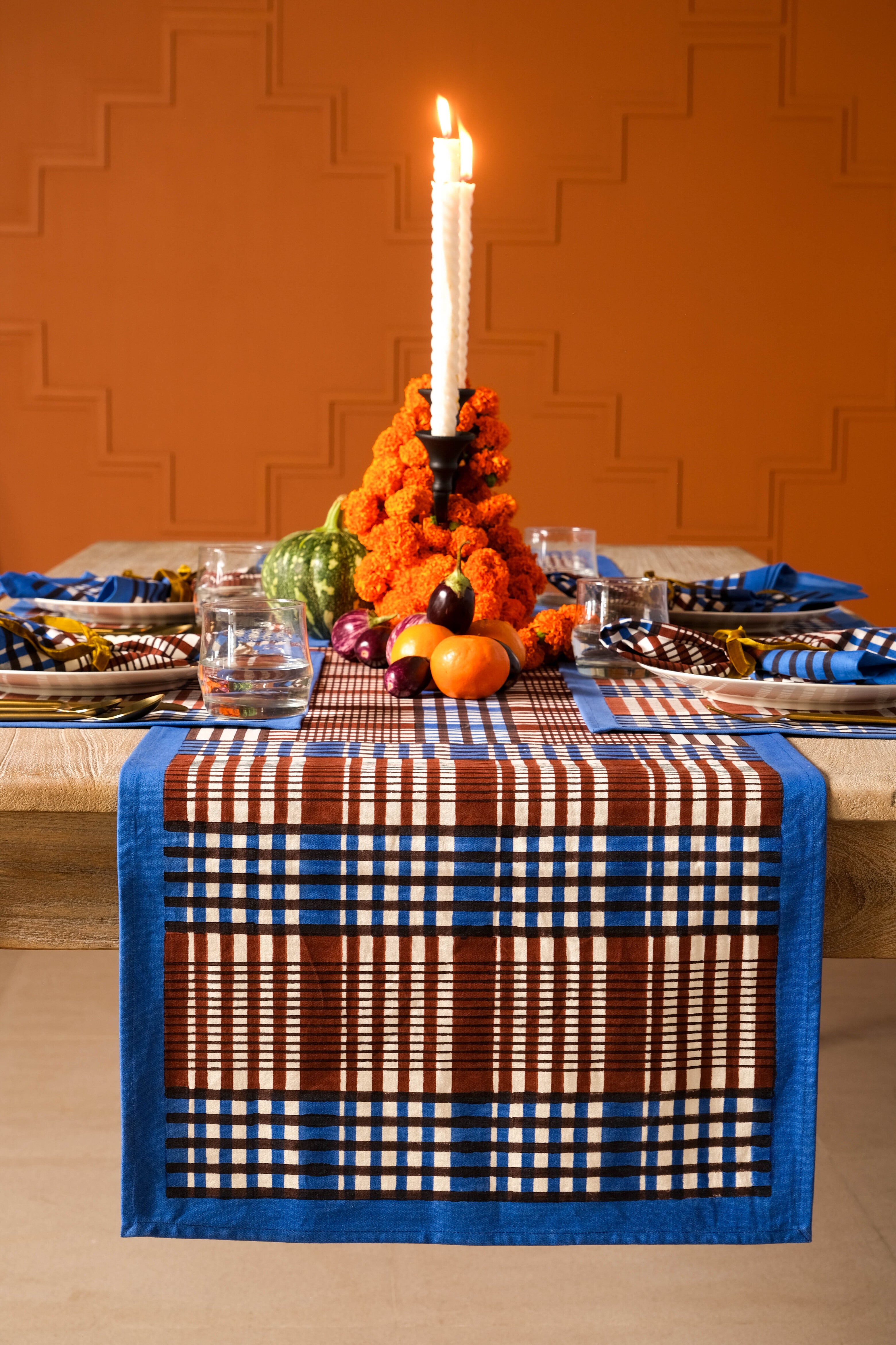 Shetland Plaid Blockprint Tablerunner in Brown and Blue
