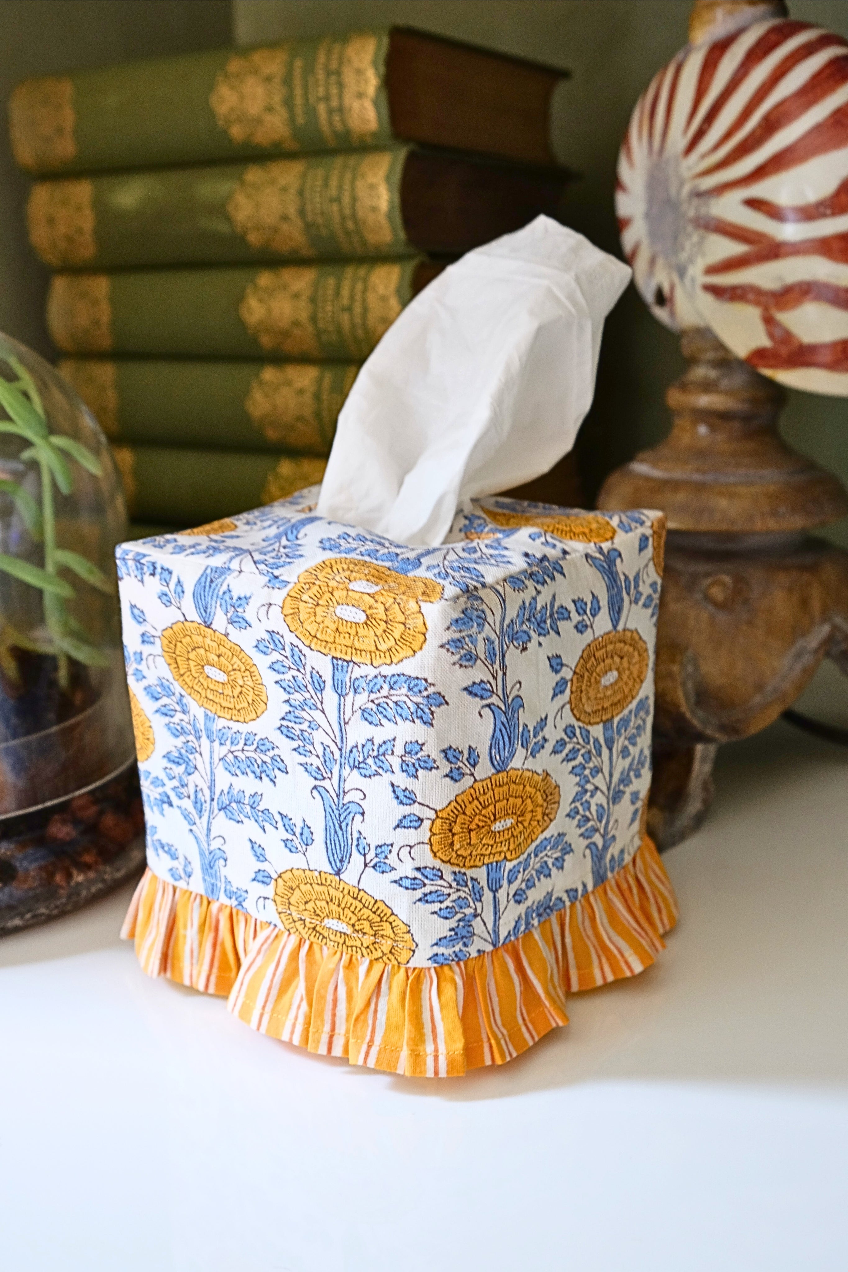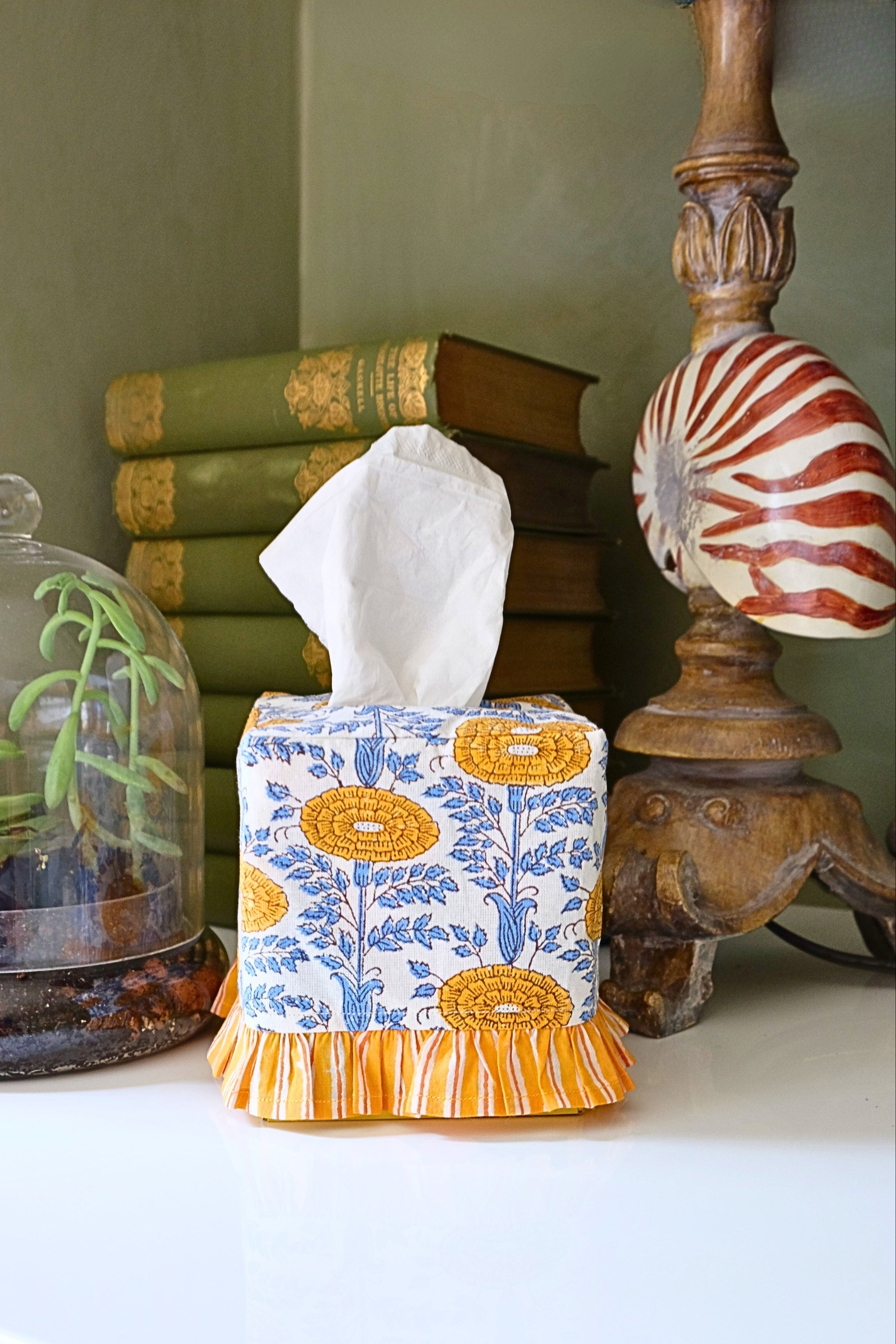 Ruffled Tissue Box Cover in Araminta Yellow Blockprint