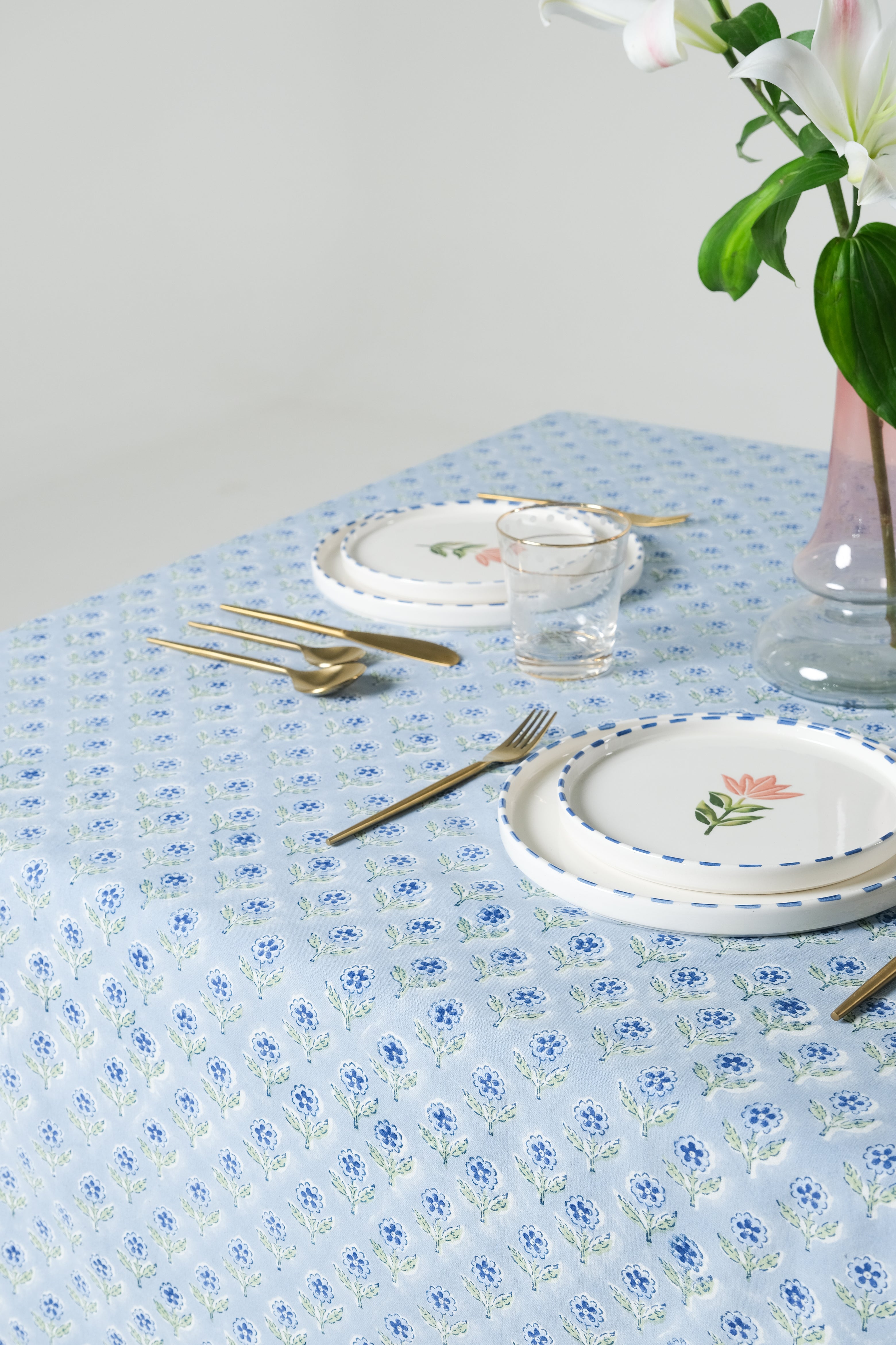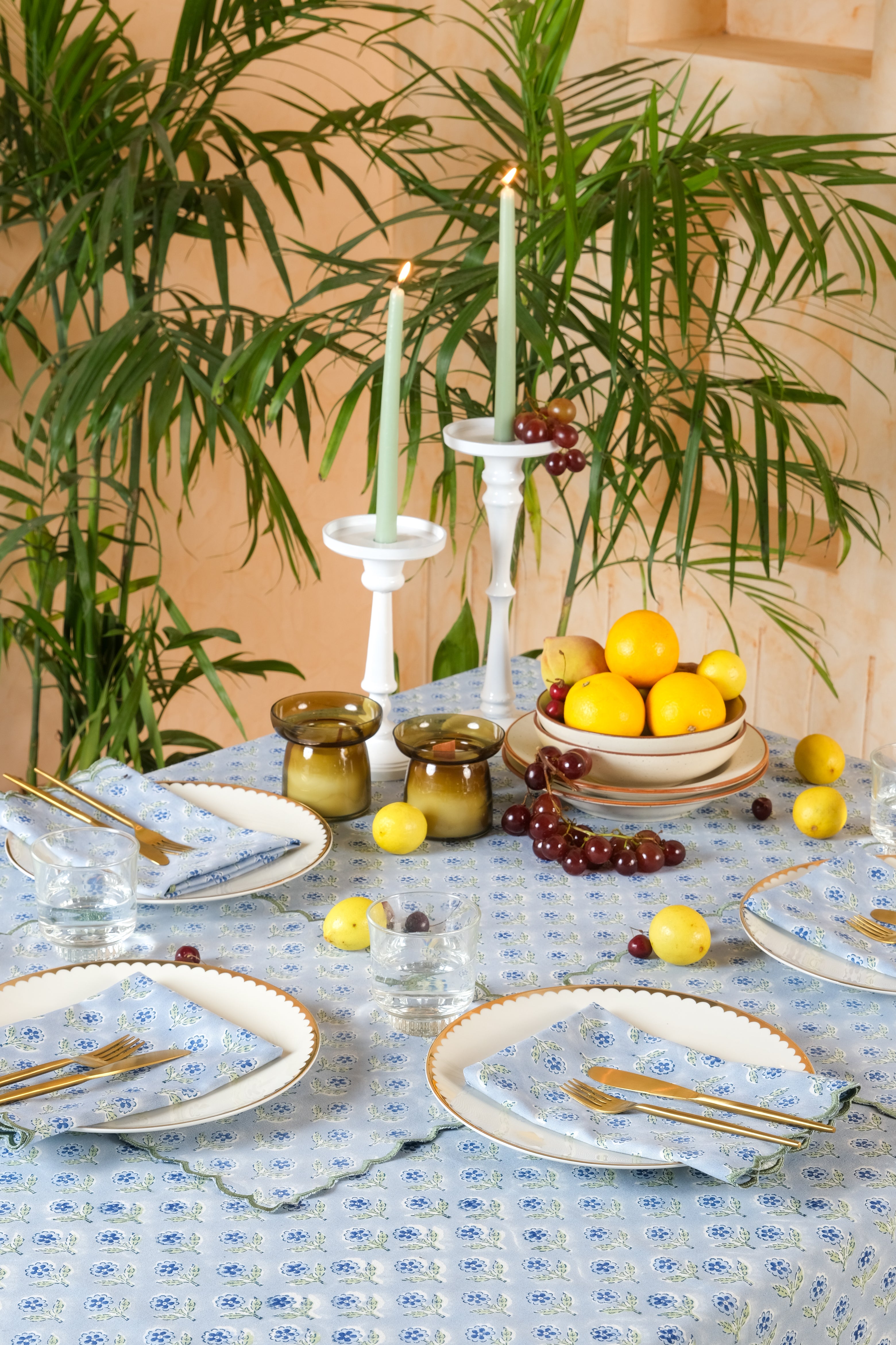 Mona Scallop Embroidered Blockprint Tablecloth in Blue