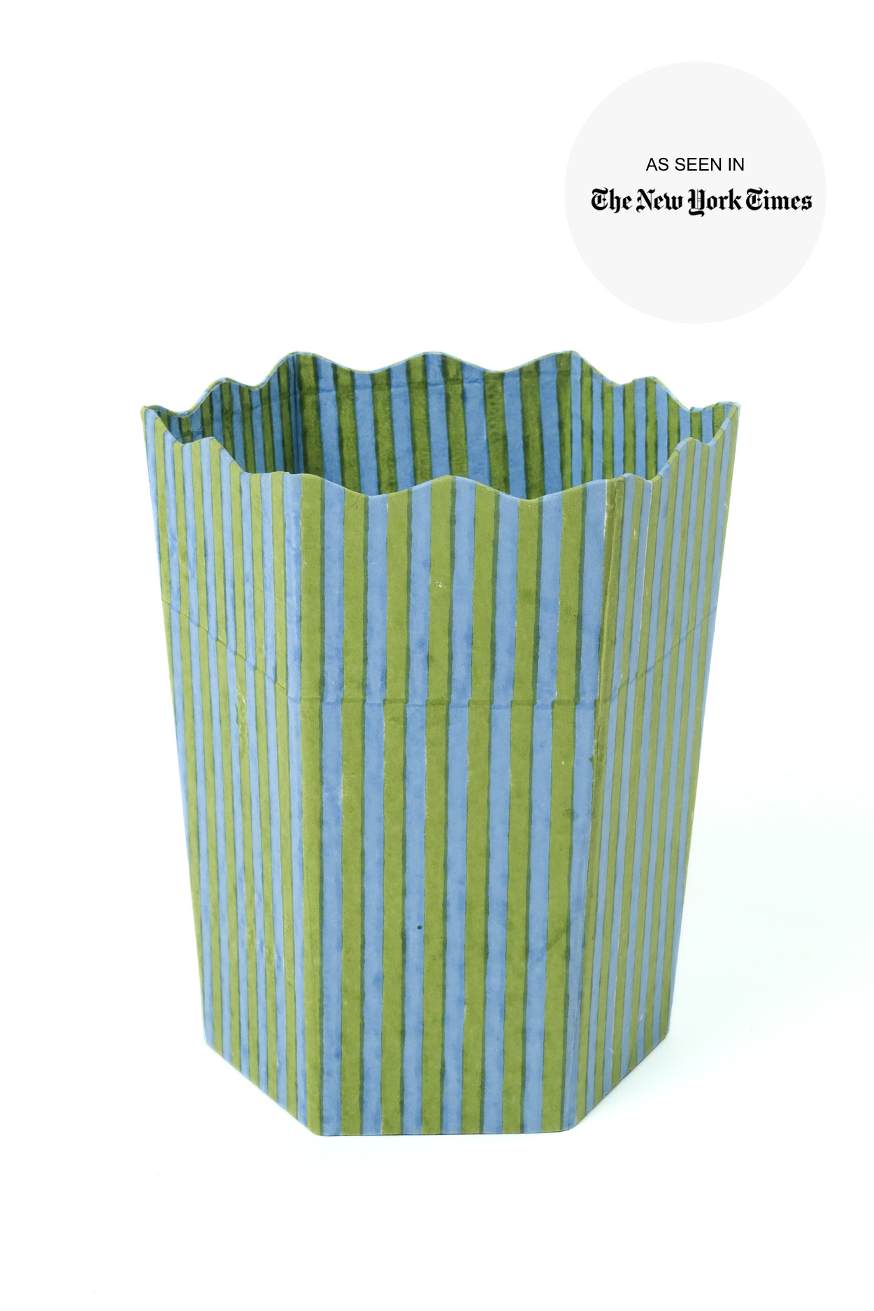 Gorgeous waste paperbasket! The most beautiful I have ever had. Bought for my office/writing room, where I want everything to represent my happy space and have a beach cottage/ocean vibe. So the colors are perfect. Packaging was exquisite. Shipping perfect. Couldn't be happier with the craftsmanship, and treading lightly on the planet (no plastic). Gorgeous. Keep making high-qualty, elegant design! Thannk you